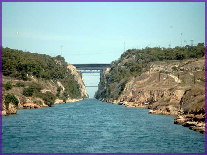 Het loopt van noordwest naar zuidoost - van de Korintische golf naar de Saronische golf - en werd in het laatste decennium van de negentiende eeuw aangelegd, zodat de Peloponnesos sindsdien écht een eiland is. Het lijnrechte kanaal is 6,3 km lang, 23 m breed en zo’n 8 m diep. De grote gaten in de wand zijn veroorzaakt door springstof, toen in de tweede wereldoorlog de doorvaart werd geblokkeerd.