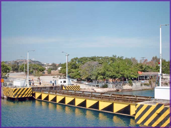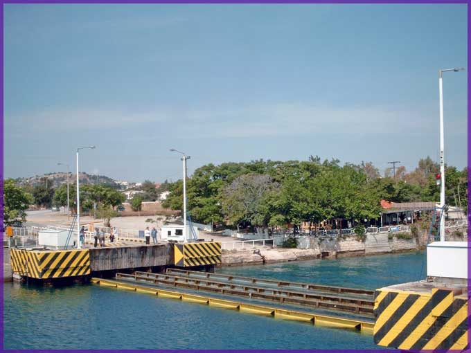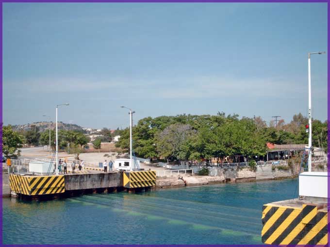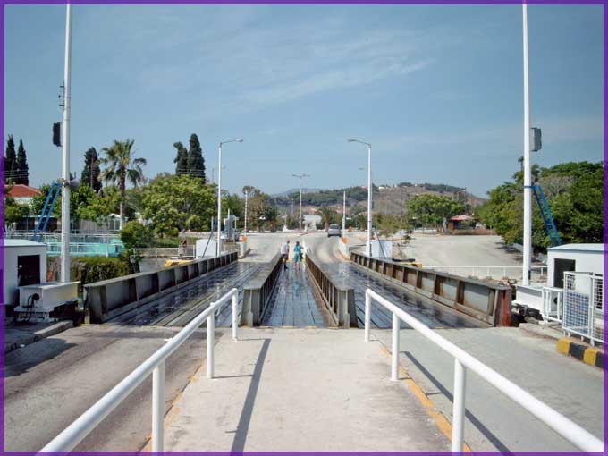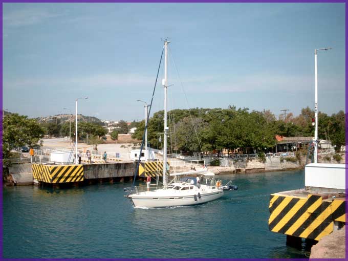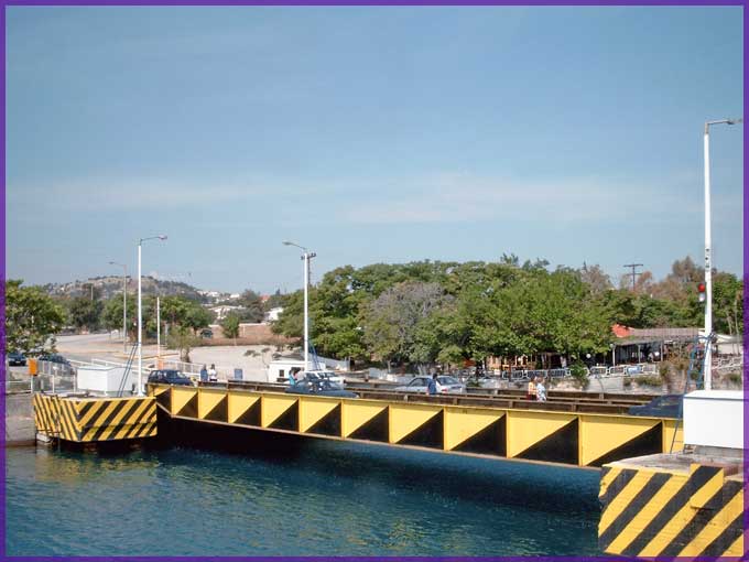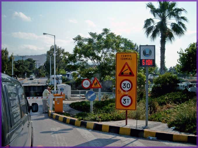 De brug van Isthmia is naar beneden; nog vijf minuten (Griekse tijd) vooraleer ze weer opduikt